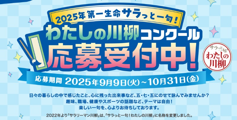 家電の高額懸賞 食品・飲料の高額懸賞ルンバや高級牛などが当たる第一生命のわたしの川柳コンテスト! キャンペーン名:2025年 第一生命 サラっと一句!わたしの川柳コンクール賞品1:iRobot ルンバ/1名様賞品2:米沢牛 すきやき肉/9名様賞品3:エスサワダ 本格中華コレクション/90名様賞品4:博多きんしゃいぷりん/500名様 締切: 2025年10月31日(残り 24 日)条件:作品・アイデアを投稿して応募企業:第一生命保険 この懸賞に応募