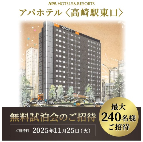 国内旅行・海外旅行の高額懸賞アパホテル「高崎駅東口」の無料試泊会招待券が当たる豪華懸賞! キャンペーン名:アパホテル「高崎駅東口」無料試泊会のご招待賞品:アパホテル 高崎駅東口 無料試泊券人数:最大240名様 締切: 2025年11月25日(残り 44 日)条件:会員登録して応募企業:アパホテル この懸賞に応募